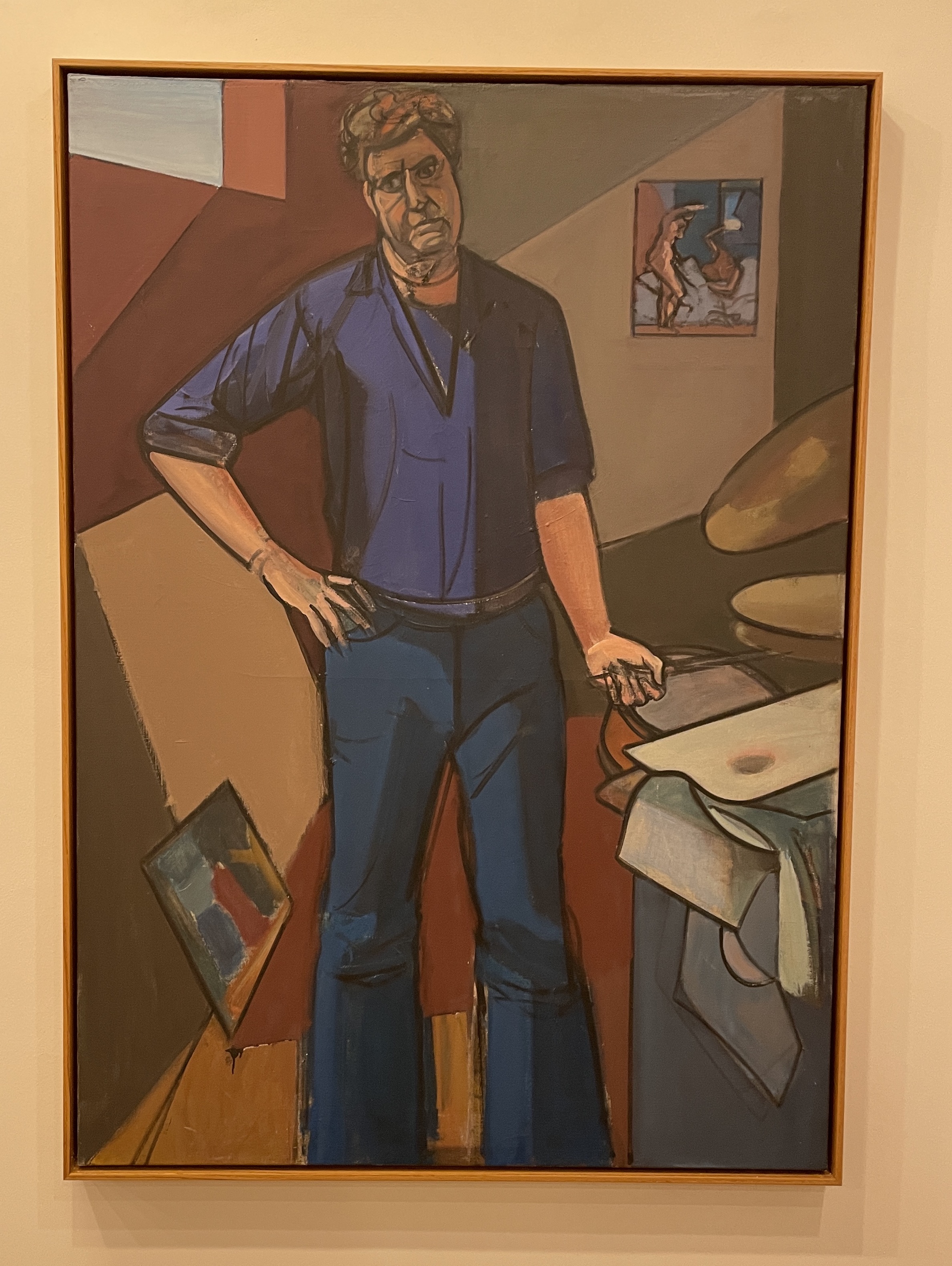 To stand in front of this near life-size painting gives an entirely new sensation. Bell presents himself as both musician and painter, holding the drumstick where the brush might be. He gazes down at the abstraction on the floor as if that’s the music score to be played…Behind him on the wall hovers his own painting.