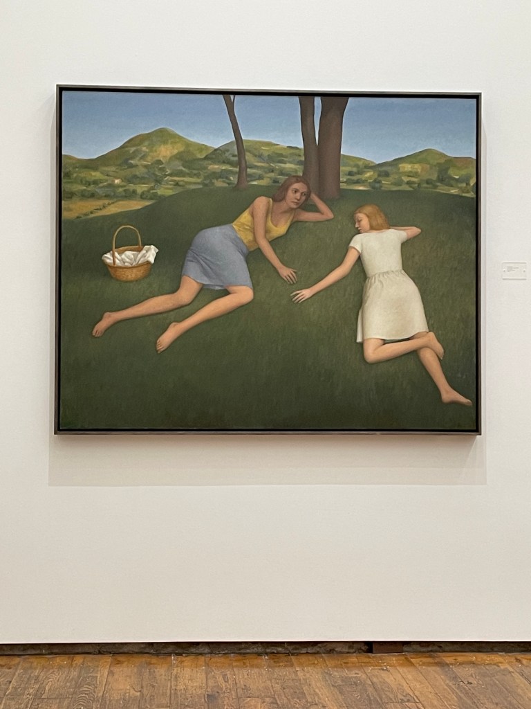 The other painting that captured me was the one of two women (adrift in afternoon daydreams) on the grassy knoll. The negative shapes are like continents in an aerial world map. The blended colors of the field separates from the place where the hills are, the distance, where a warmer palette reigns. The familial females doze in a wispy sharing.