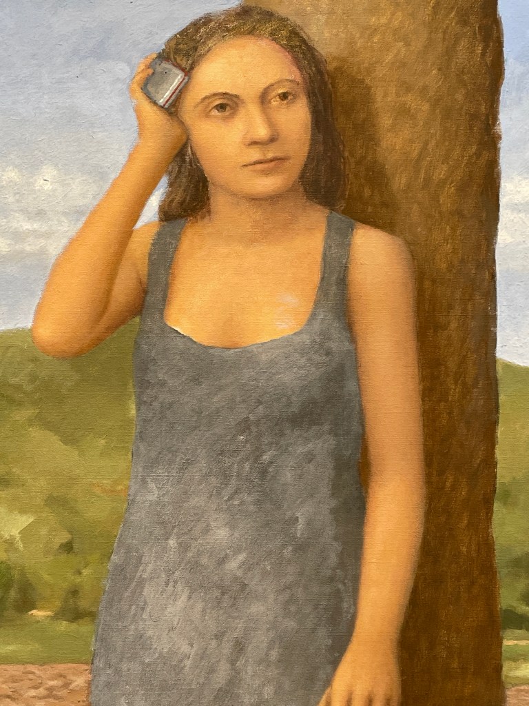 I especially like the young woman with the phone (at left), how the painting is realized. Its brushstroke is open and relatively loose. Apparently the landscapes, like his table-scapes, are inventions. There is no actual horizon like that in Umbria, though it is similar to a road on the other side of the hill from the road where the Baileys used to travel to their house.