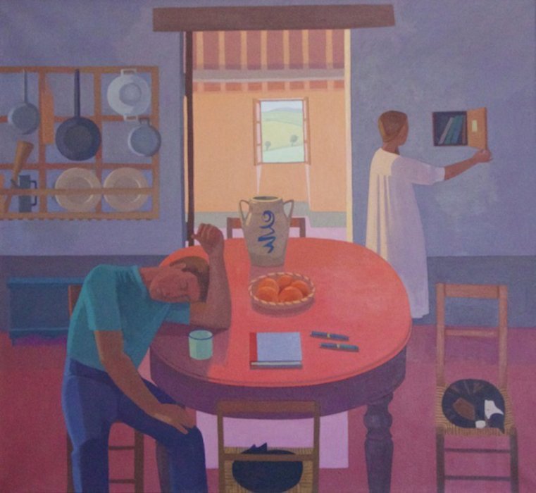 Last fall I had finished reading Ulysses: A Reader’s Odyssey by Daniel Mulhall…It helped me make some way into the actual text. Caren’s painting of the Kitchen (with vase in middle) and the one inspired by Marquez’s One Hundred Years of Solitude had captivated and stirred me…I realized that both authors open facets, vantages, and conclusions of a narrative that have potent parallels in painting.