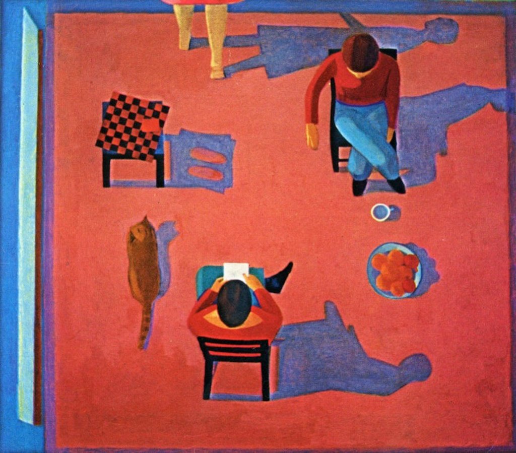 I spend a lot of time with her painting called A Fall. The gestures and positions show mastery of the language of these forms, their succinct narrative message, as in Giotto. And then that still life on the bureau is suggestive, of course, of Bailey’s still lifes. The shadow under the furniture arrives as one color and leaves as another (burnt umber to an olivie raw umber), the kind of transition Bill loved (and would point to, in Hopper). The diagonal of the chair, the gentle decline of the cane, all set us up for witnessing the fall. And the hold of the woman is made palpable/empathized by the near juxtaposition of the vertical striped (mauve and quiet yellow) chaise. Then that light in the distant room is so delicate and of a different nature than the raking light in the foreground. The light suggests a coming event, an after time. Blue becomes green becomes purple…