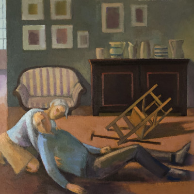 I spend a lot of time with her painting called A Fall. The gestures and positions show mastery of the language of these forms, their succinct narrative message, as in Giotto. And then that still life on the bureau is suggestive, of course, of Bailey’s still lifes. The shadow under the furniture arrives as one color and leaves as another (burnt umber to an olivie raw umber), the kind of transition Bill loved (and would point to, in Hopper). The diagonal of the chair, the gentle decline of the cane, all set us up for witnessing the fall. And the hold of the woman is made palpable/empathized by the near juxtaposition of the vertical striped (mauve and quiet yellow) chaise. Then that light in the distant room is so delicate and of a different nature than the raking light in the foreground. The light suggests a coming event, an after time. Blue becomes green becomes purple…